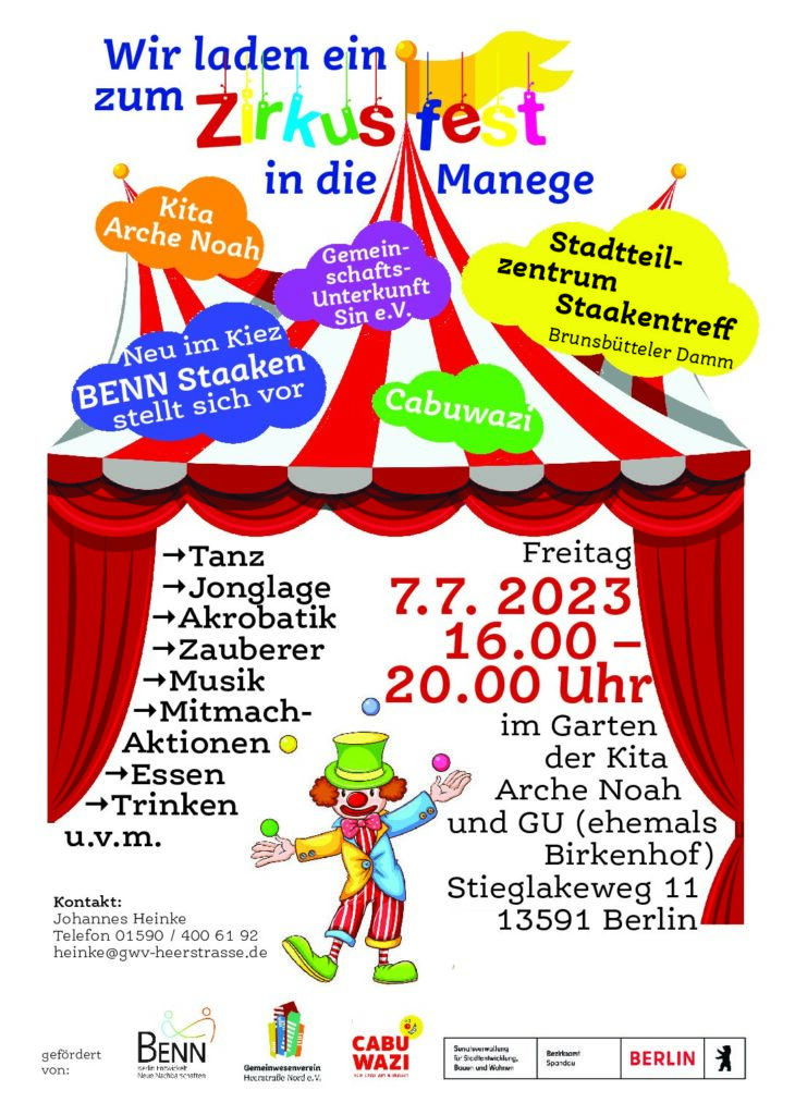 Auftakt von BENN beim Staakener Zirkusfest Freitag, 07.07.202316 – 20 Uhr Garten der Kita und der Gemeinschaftsunterkunft Stieglakeweg 11 / Spandauer Str. 2213591 Berlin Johannes Heinke 0159 040 061 92 benn-staaken@gwv-heerstrasse.de