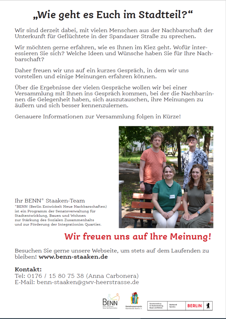 Am 27. April trafen sich die Bewohner: innen von Staaken bei strahlendem Sonnenschein, um über ihre Nachbarschaft zu sprechen. Etwa 20 Teilnehmer: innen verbrachten drei Stunden zusammen und tauschten ihre Ideen und Anliegen aus. Nach einer kurzen Vorstellung des BENN-Programms, des BENN-Teams sowie der Referentin Frau Thanner (Senatsverwaltung für Bauen, Wohnen und Stadtentwicklung) und der …