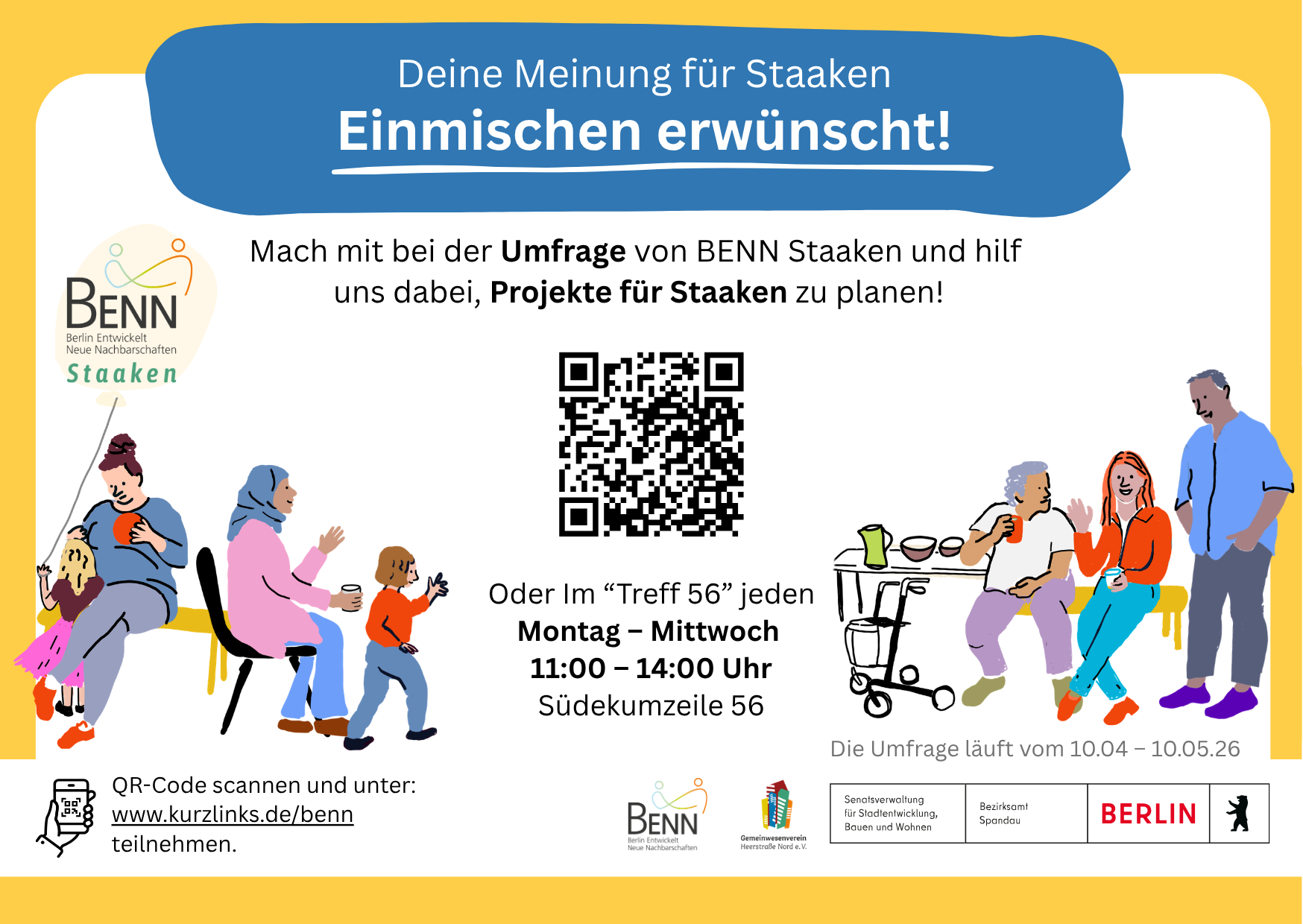 Unter dem Motto „Einmischen erwünscht“ möchte das BENN-Team erfahren, welche Themen und Projekte den Menschen in Staaken besonders wichtig sind. Damit das Team mit eurer Hilfe bessere Arbeit für Staaken leisten kann! Dafür gibt es eine online Umfrage, bei der Ihr genau das mitteilen könnt.