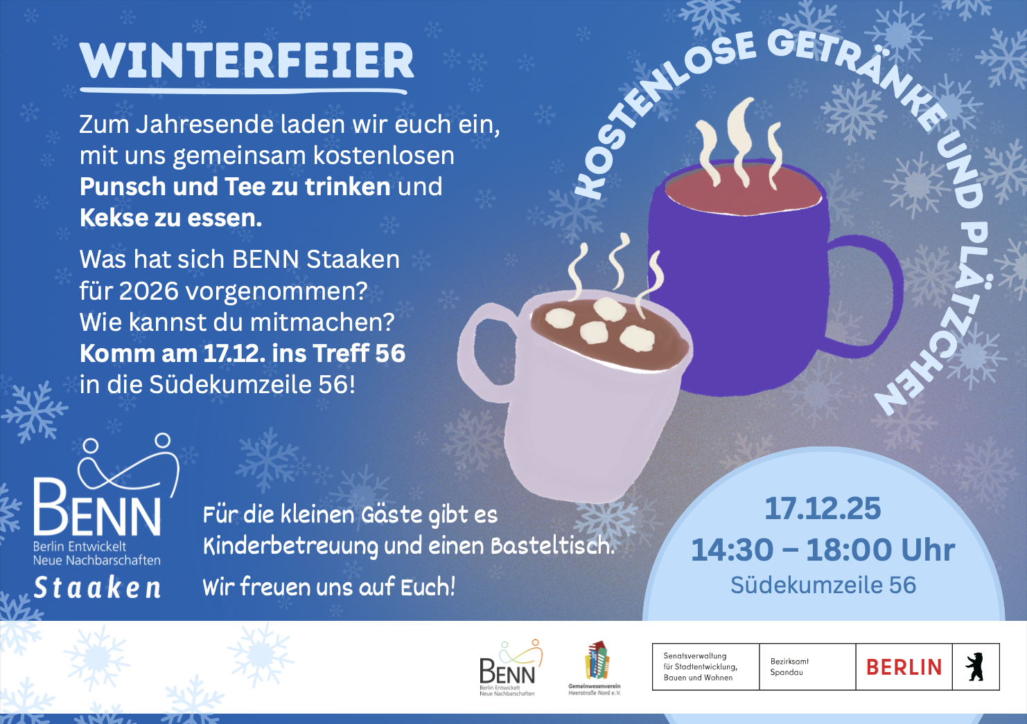 Zum Abschluss werden die kommenden Angebote von BENN Staaken vorgestellt, und es bleibt genug Zeit, um sich kennenzulernen und miteinander ins Gespräch zu kommen. Die Ergebnisse dieses Forums fließen direkt in die Planung zukünftiger Veranstaltungen ein.